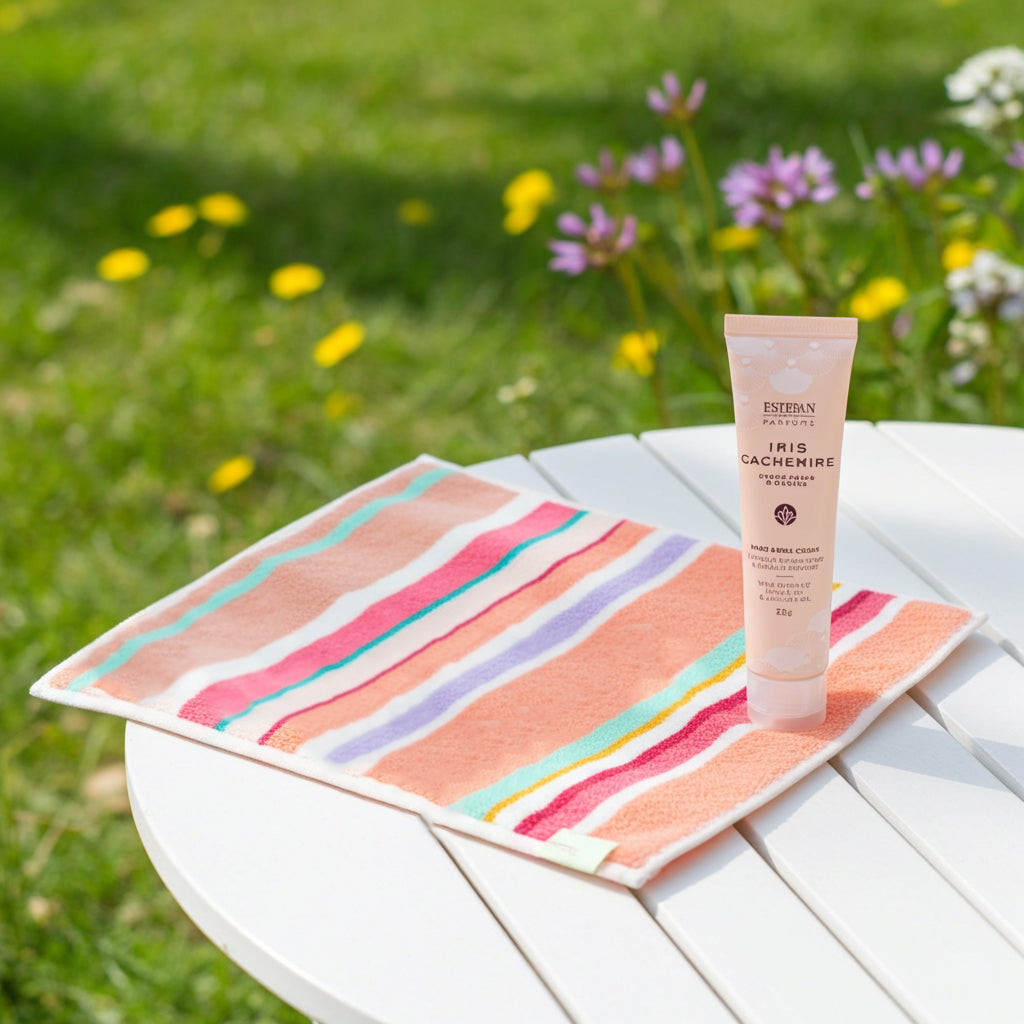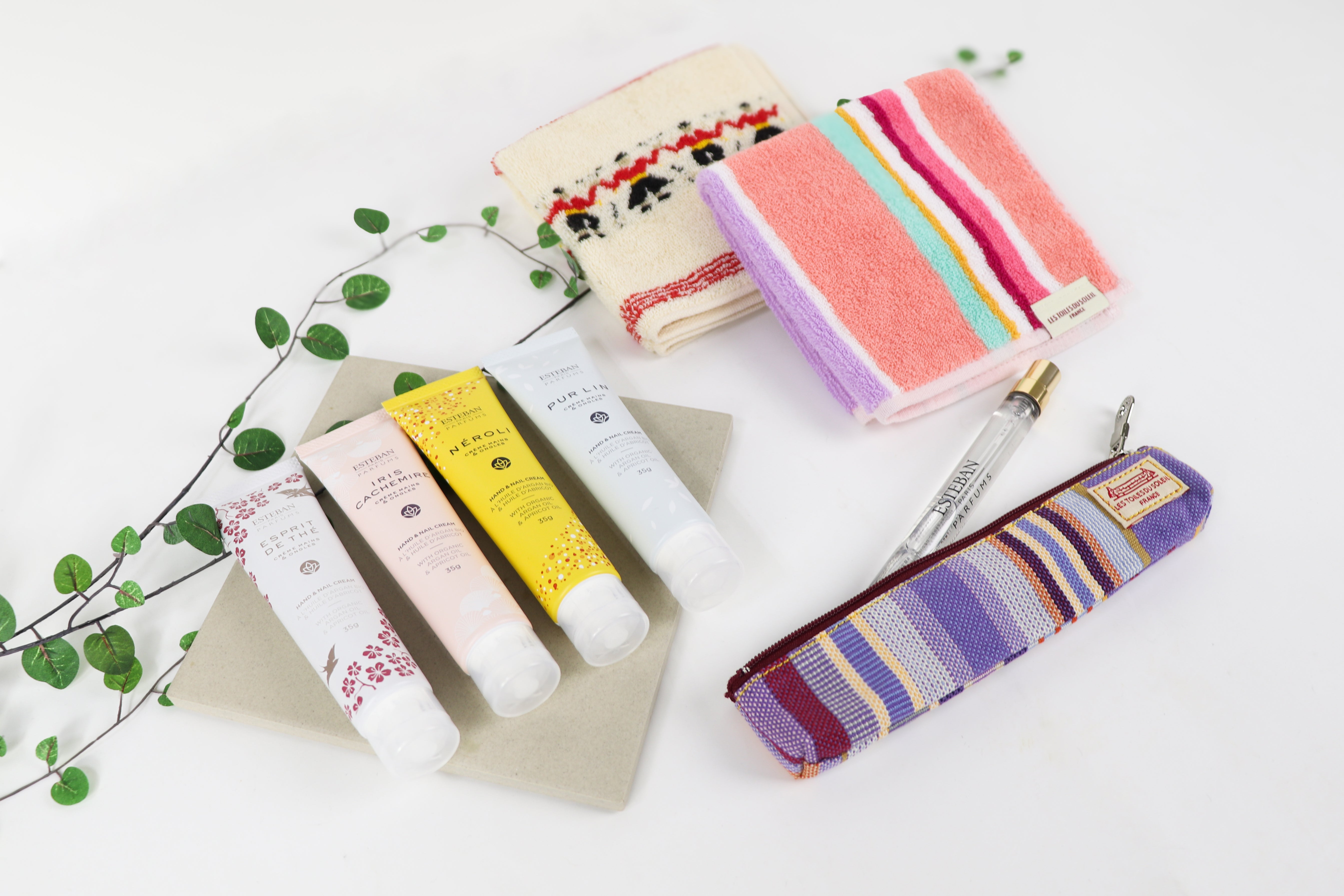フランスの鮮やかな色彩と日本の誇る品質が出会った、レ・トワール・デュ・ソレイユの「今治タオルハンカチ」と、ESTEBANの香り豊かなフレグランス ハンド&ネイルクリームをセットでお届けいたします。